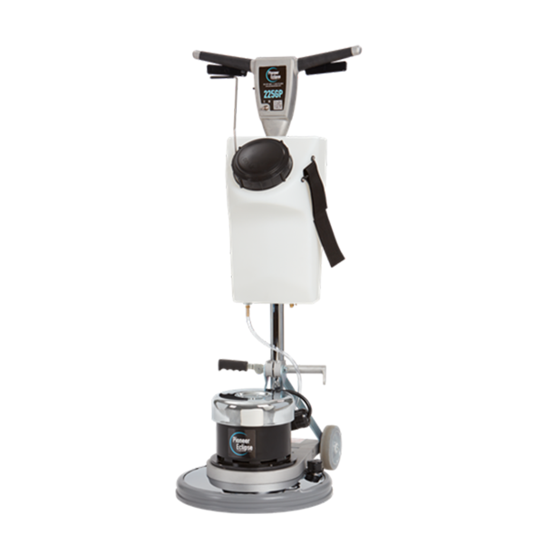 La 225GP utilise un engrenage a triple disque actionné par un moteur de 1.5 HP (1,1 kW). Pour plus de sécurité, la machine est équipée d’un cordon d’alimentation de 40’ et d’un disjoncteur différentiel. Le réservoir peut contenir jusqu’a 2.5 gallons (9,5 litres) de solution et la jupe intégral de la machine contient les éclaboussures, et aide à contenir et à collecter la poussière.